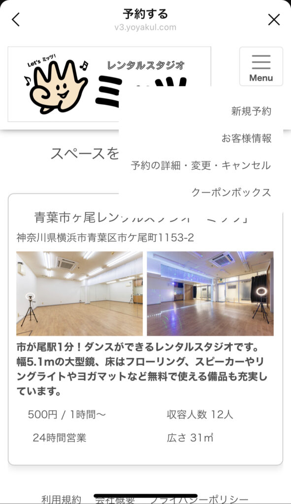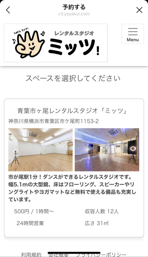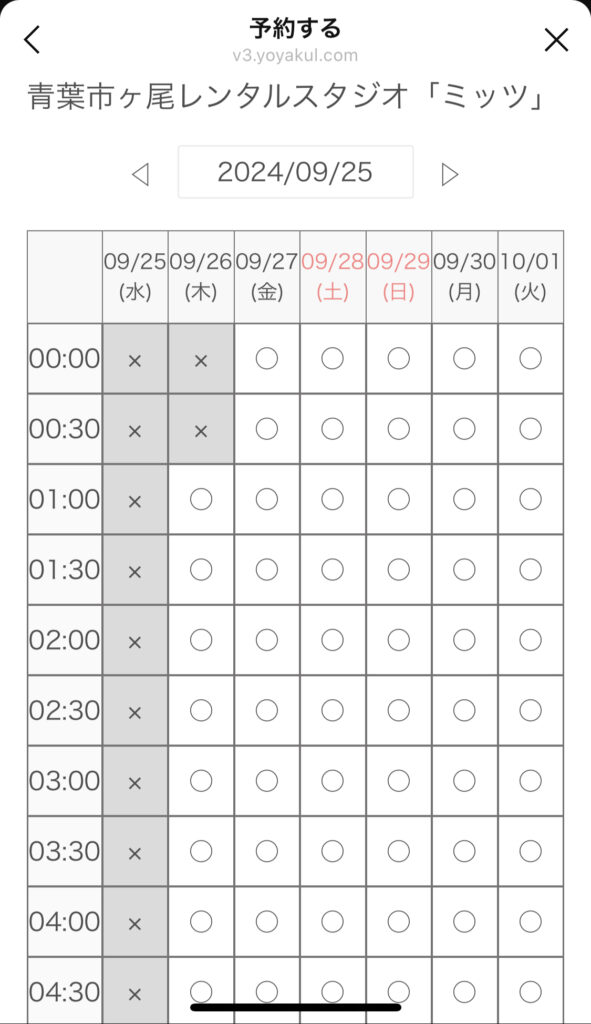 ②予約するスタジオを選び、希望日時に空きがあればその日時を選びます。