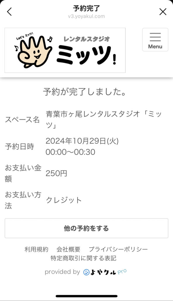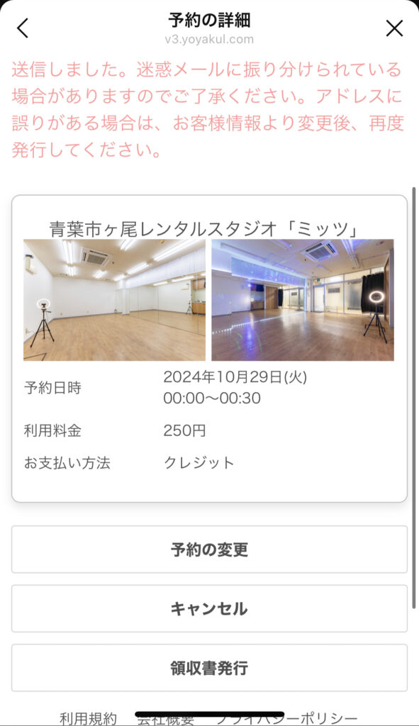 ④予約が完了すると、予約内容・ご利用案内・アクセス・鍵の開け方などの詳細が書かれてるメッセージが届くので、それを確認します。